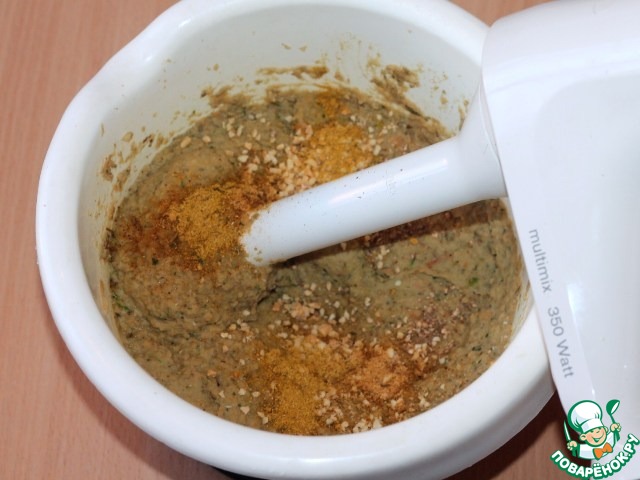 8. измельченные орехи, приправу. Блендером измельчаем все ингредиенты до однородности. Обязательно попробуйте паштет на вкус, если нужно – подсолите и добавьте перчика (или чеснока).