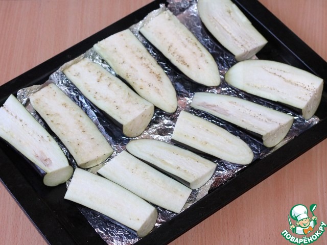1. Баклажаны разрезаем пополам и отправляем запекаться в духовку до полного размягчения. Затем даем время остыть, очищаем от кожицы и режем крупными кусочками.