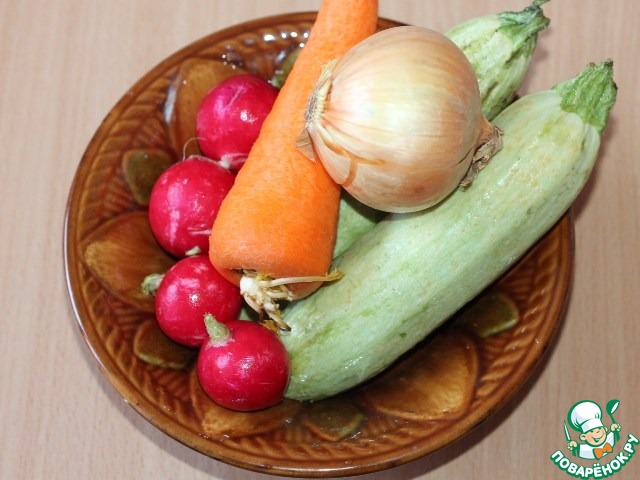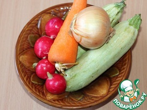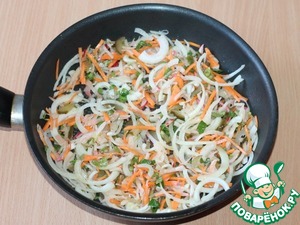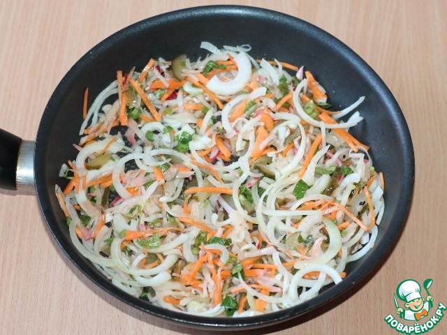 3. Добавить в сковороду очищенную и порезанную морковь и редис.