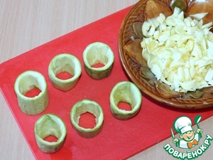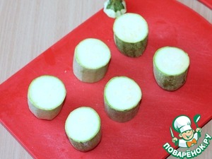 4. Кабачки длиной до 15 см вымыть, дать воде стечь. Отрезать плодоножки, разрезать каждый кабачок на 3 части...