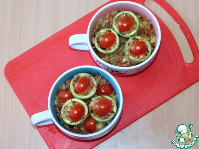 8. Отправляем формочки в духовку, разогретую до 180 С, и запекаем до готовности кабачка. Приготовленное блюдо украшаем зеленью петрушки и подаем на стол.