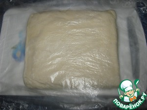 Доску подпылить мукой, положить тесто, накрыть пленкой и убрать в холодильник на 30 минут. Это нужно для того, чтобы тесто отдохнуло и остыл жир.