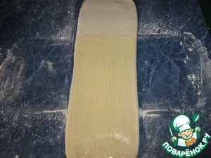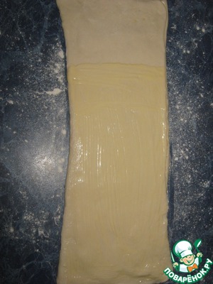 Тесто раскатать в прямоугольник, оно мягкое, податливое и очень легко раскатывается. Смазать две трети растопленным маргарином. Т. е. делим зрительно полосу на три части, смазываем две, дальнюю из них не смазываем.
