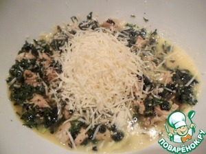 Взбить перепелиные яйца, добавить к ним пассированную зелень, курицу и натертый сыр. Получается довольно густая масса.
