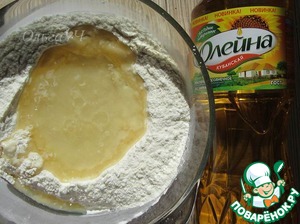 Сделать углубление и влить воду с маслом, перемешать.