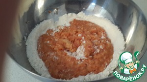 • Смешиваем сахар 250г., цедру апельсина или лимона, или 2ст. ложки какао с томатным соком (у меня в данном случае домашние заготовки - помидоры пропущенные через мясорубку, без соли сахара и уксуса и закатанные на зиму, но раньше всегда делали на томатном магазинном соке или разводили томатную пасту в хороший (насыщенный) томатный сок). На заметку: в тесто можно класть меньшее количество сахара, 200гр.
