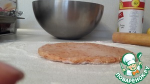 • Тесто разделяем на две части, слегка обмакиваем в муке и раскатываем пласт толщиной 0,5-0,7 см.