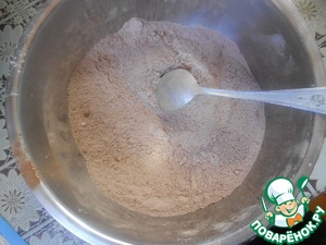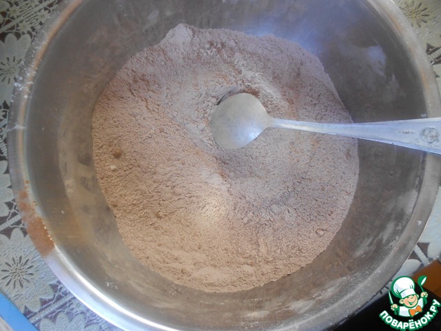 В миску всыпьте просеянную муку, какао, разрыхлитель, соль, ванилин.