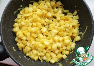 С картофеля слить воду и обтереть его полотенцем. Добавить к овощам и обжаривать при постоянном помешивании 3 минуты, затем снять огня.
