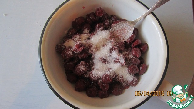 Тем временем берем вишню, у меня вишня консервированная в собственном соку, высыпаем в дуршлаг, засыпаем сахаром, перемешиваем, оставляем стекать лишнему соку