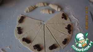 Достаем тесто из холодильника, делим на 4 части,3 части ложим назад в холодильник, оставшуюся часть раскатываем около 3-4 мм в круг и делим этот круг на 12 равных частей, на каждую часть положить по 3 вишенки и скрутить в рогалик