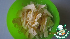 Сливочное масло нарезать и добавить к сырной массе