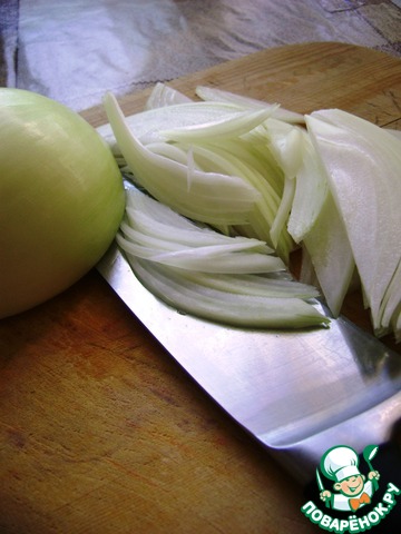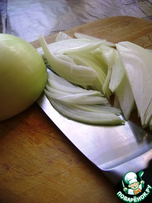 • Лук нашинковать тонко вдоль луковицы. Перец нарезать уголками немелко.