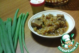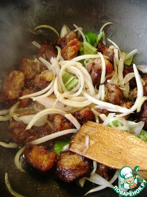 • Раскалить масло и жарить ребрышки с луком и перцем, часто помешивая, до румяной ровной корочки.