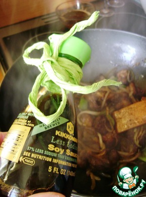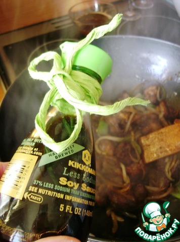 • Полить соевым соусом ТМ«Киккоман», помешивая, жарить, пока соус не выпарится.