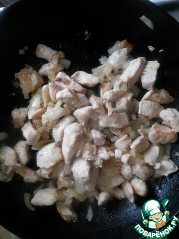 Луковицу режем мелкими кубиками. Добавляем к курице, перемешиваем. Обжариваем курицу с луком, помешивая, минуты 3-4, пока лук не станет прозрачным и чуть начнет румяниться.