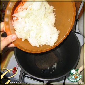 В любимый казан на дно льем масло (я немного совсем лью) и кладем нарезанный мелко лук (я режу на Бернеровской терке, очень ровно и быстро)