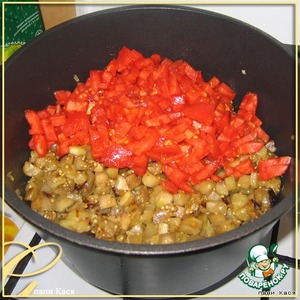 Пережарили - сверху добавляем помидоры, очищенные от шкурки и порезанные, тушим полчасика, минут 40, солим, добавляем сахар - все по вкусу