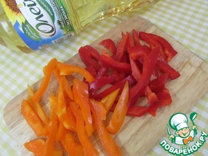• Болгарский перец помыть, обсушить, освободить от плодоножки и семян. Нарезать соломкой.
