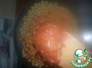 И готовим пассировку из лука (обжариваем на растительном масле), помидора (можно обдать кипятком, чтобы снять шкурку), порезанного на кубики, чеснока (пропущенного через пресс или порезаного), и томатной пасты -