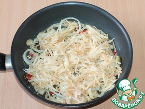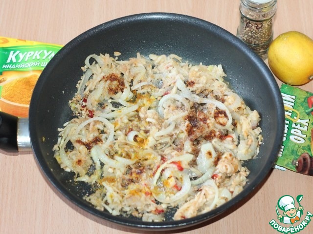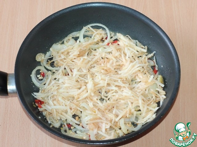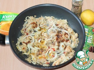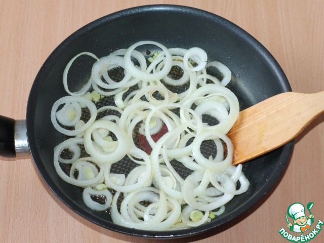3. Репчатый лук тонко порезать кольцами и обжарить до прозрачности на остро-чесночном масле. Огонь убавить до тихого и при таком тихом огне начинаем быстро добавлять подготовленные продукты.