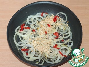 2. В разогретом масле (2-3 ст. л.) обжарить перец чили и порубленный чеснок. Чеснок удалить, а перец выложить на блюдо. Перец желательно не зажаривать, выложить его раньше, чем чеснок.