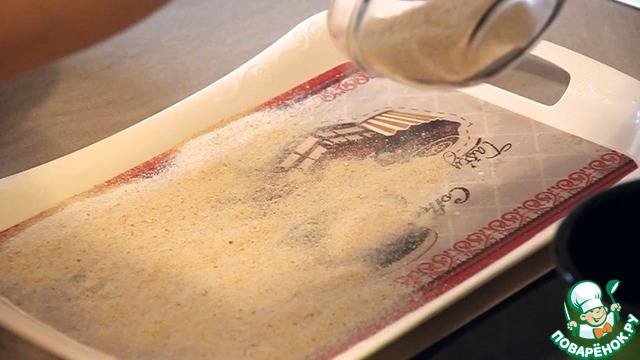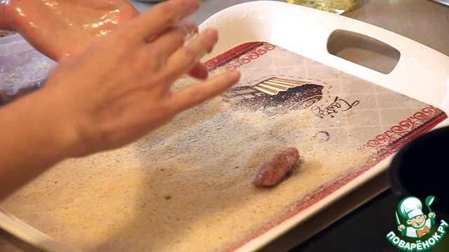 • Тем временем подготавливаем поднос и посыпаем его панировочными сухарями. Так будет быстрее и удобнее обваливать в панировке маленькие котлетки.