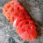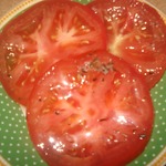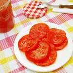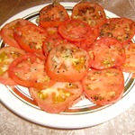 А далее всё просто! Каждый кружочек солим с двух сторон, укладываем в банку, как у меня, либо в пищевой контейнер и каждую помидорку поливаем нашим соусом.