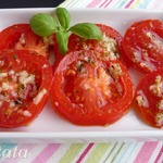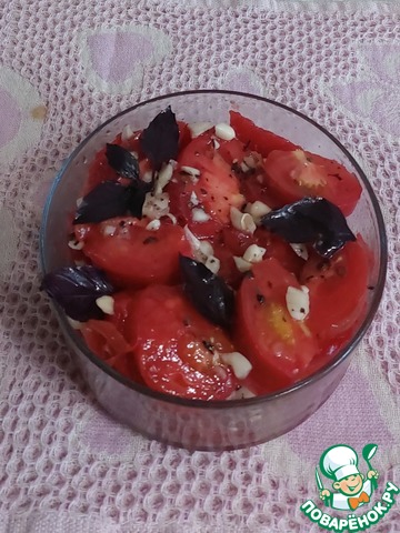 Очень вкусные помидоры, которые приготовить не составит труда. Для любителей чеснока блюдо подойдёт идеально. Такая закуска отлично сочетается с мясом и картофелем.