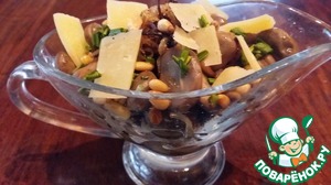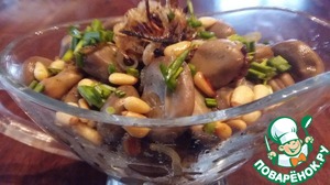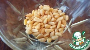 Луковицу порезать полукольцами и обжарить на растительном масле. Посолить, поперчить и приправить прованскими травами. Кедровые орешки слегка подсушить на сковородке.