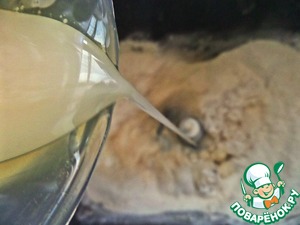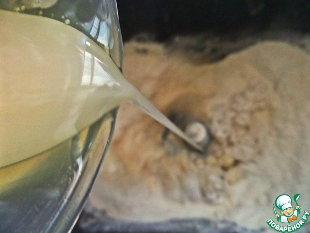 Включить программу "замес теста" (1 ч. 30 мин.) и вливать жидкий состав в мучной.