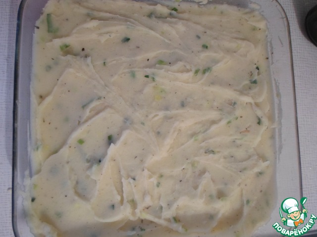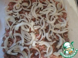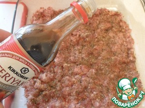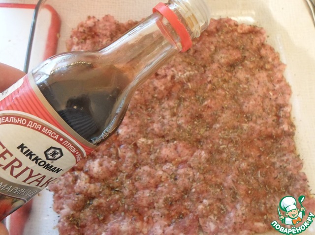 Фарш выкладываем на дно формы, посыпаем всеми специями, поливаем соусом-маринадом.