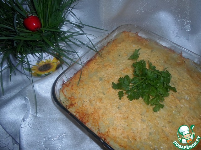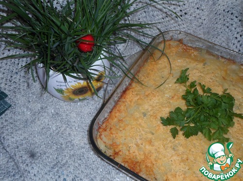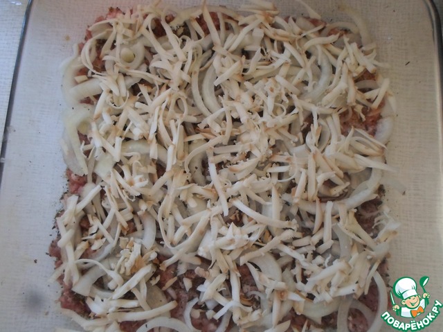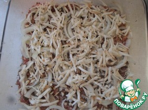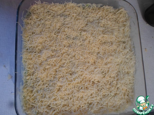 Сверху присыпаем твердым сыром потертым на мелкой терке. Отправляем запекаться, в предварительно разогретую до 200-220 градусов духовку, на 40 минут.