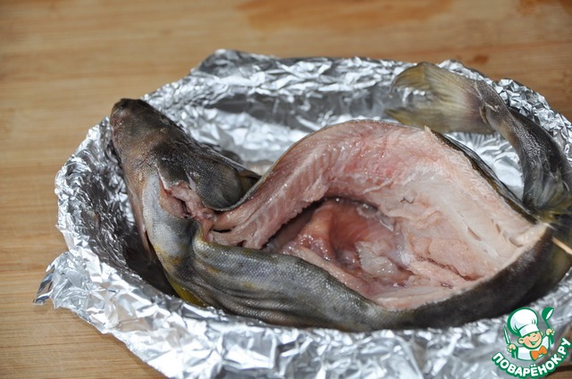 Кладём в форму рыбу. У меня окунь крупный, пришлось его немного "извернуть".