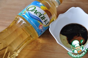 Делаем маринад. Смешиваем подсолнечное масло "Олейна", рисовое вино, соевый соус, кунжутное масло и соус чили.