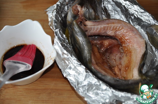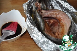 Обильно смазываем кисточкой рыбу маринадом снаружи и внутри.