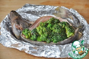 Кладём внутрь рыбы брокколи. У меня слегка оттаявшая замороженная.
