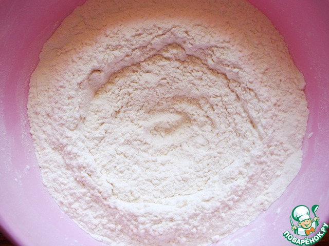 В миску просеять муку с солью, сделать ямку.