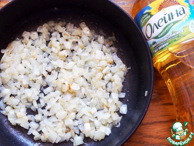 Лук почистить, помыть, порезать кубиками и обжарить на растительном масле.