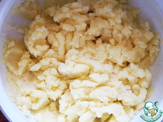 С картофеля слить отвар, но не выливать его. Размять картофель, добавить 80 мл. картофельного отвара и ещё раз размять.
