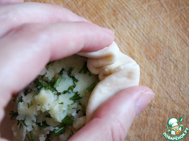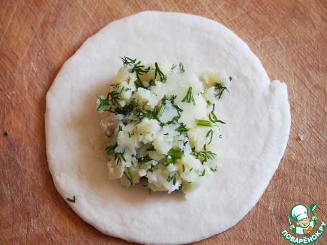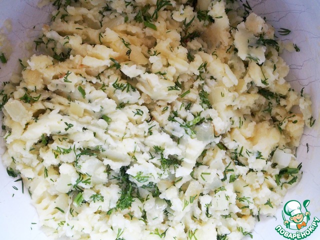 В картофельное пюре добавить укроп, перец и обжаренный лук. Хорошо перемешать. Начинка готова.