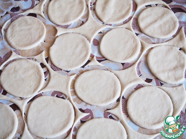 Тесто тонко раскатать и выдавить круги, диаметром 8-9 см.