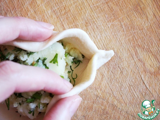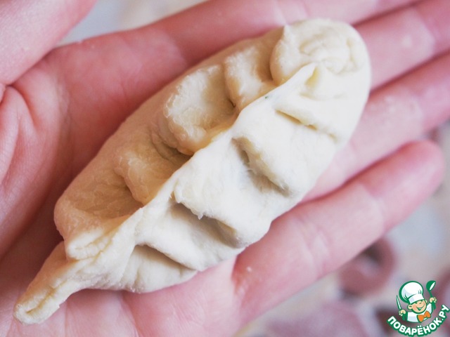 Вначале соединяем концы, как на обычных пельменях.