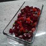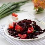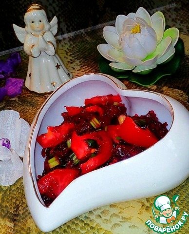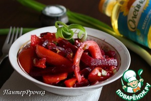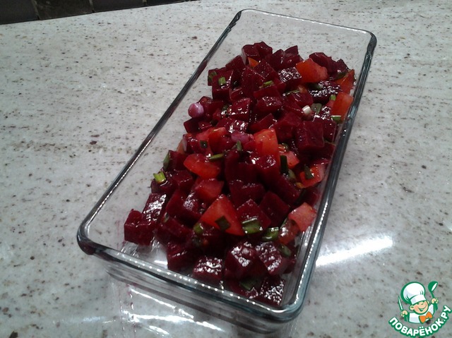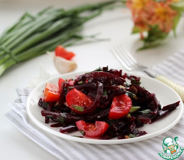 Свеклу запечь в духовке или отварить до готовности. Почистить и нарезать небольшими брусками. Помидоры нарезать дольками. Важно брать вкусный, спелый помидор.