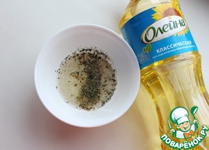 Сделать заправку. Смешать подсолнечное масло, белый винный уксус, перец, соль и мелиссу.