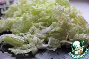 Пекинскую капусту помыть, зеленую часть не очень мелко нарезать или нарвать руками.