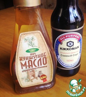 Для маринада будем использовать кунжутное масло, соевый соус "Кикоман". Соус "Терияки у меня другой фирмы, отлитый в бутылочку непрезентабельного вида (подруга поделилась).