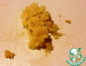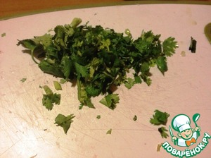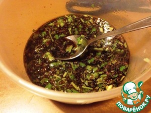 К смеси соусов добавить кинзу, имбирь и кунжутное масло. Перемешать.