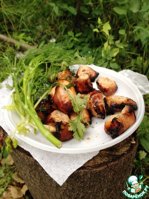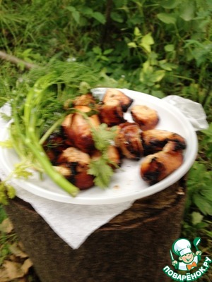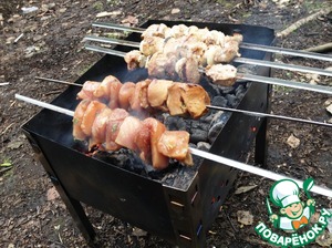 Промаринованное филе нанизывать на шампура и жарить на мангале со всех сторон.