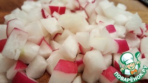 Нарезать мелко белый лук. Если у Вас обычный репчатый лук, положите его в дуршлаг и обдайте кипятком.